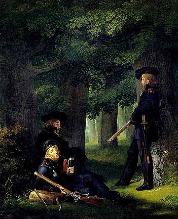 Auf Vorposten - Die Lützower Jäger Heinrich Hartmann (liegend, links),Theodor Körner (sitzend, mitte), Friedrich Friesen (stehend, rechts) (pinxit Georg Friedrich Kersting, 1815).
